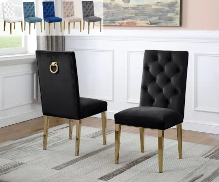 This classic set of 2 side chairs features a sumptuous velvet (Grey, Black colors) or faux leather (White color) with a unique gold stainless steel frame that combines comfort with beauty, suitable to complement dining sets.
