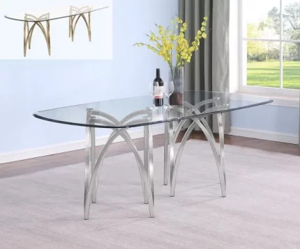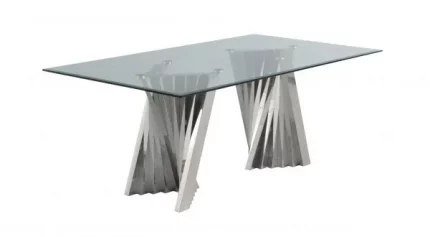 Give your dining room an unforgettable, luxurious look with this beautiful modern glass dining table. The thick clear tempered glass top is supported by a double pedestal base made of stainless steel, and attaches to the table top to provide stability. The unique, artistic design brings a distinctly glamorous, upscale look to any dining space.