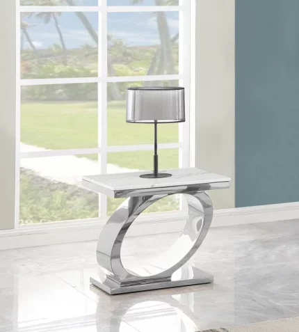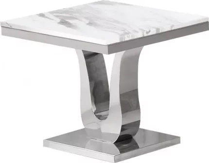 This white marble top end table with stainless steel base is perfect for adding a classy look to your living room. It has a sleek look and is a real eye catcher. Dimensions: 26″L x 24″W x 23″H Features: