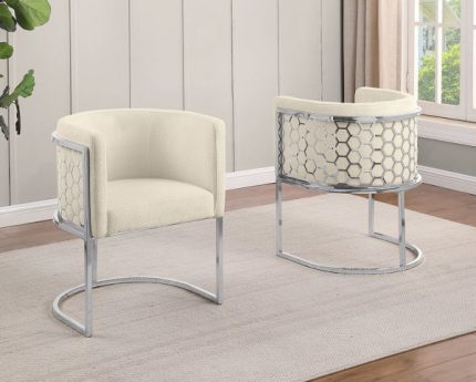 A set of 2 Chairs, standard height side chairs with uniquely textured teddy fabric upholstery, a durable iron frame with chrome finish, and an intricate honeycomb back design. These chairs are available in colors Dark Gray, Green, Black, and Cream.
