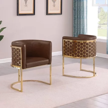 Elevate your space with this modern Leathaire side chair featuring a sleek gold chrome frame. These chairs are a fresh take on one of our top-selling series, SC034 – 7. Designed with a barrel back cushion and honeycomb frame, this chair blends luxury and comfort for any dining room, living room, or office. Available in upholstery colors Mocha, Toffee, and Espresso. Assembly required.