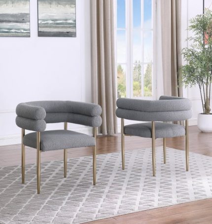 A set of 2 standard height side chairs with uniquely textured teddy fabric upholstery, a durable iron frame with gold chrome finish, and an intricate honeycomb back design. These chairs are available in colors Dark Gray, Green, Black, and Cream.