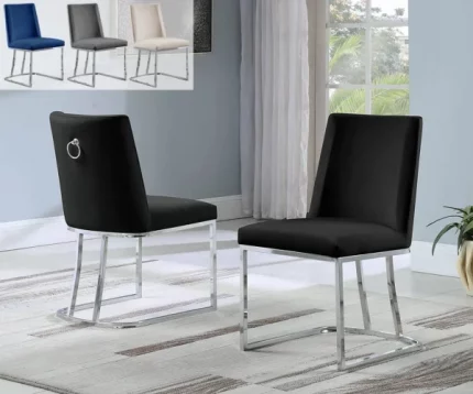 Velvet upholstered side chairs featuring a sleigh-style stainless-steel chrome base come in colors grey, black, or cream.