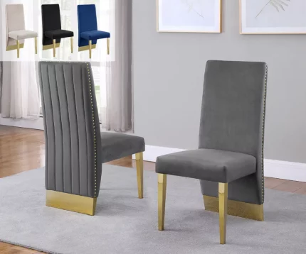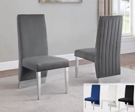This set of two (2chairs per box) velvet chairs features two chrome front legs with a chrome support. Available in grey, black, or cream, featuring nail-head trim and vertical tufted design.