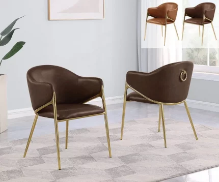 Add a touch of modern luxury to your space with this pair of Leathaire (faux leather) side chairs, featuring sleek gold chrome legs and adjustable feet. The soft, durable Leathaire upholstery mimics genuine leather while being easy to maintain, and is available in colors Mocha, Toffee, and Espresso. Perfect for dining rooms, offices, or lounge areas, these stylish chairs enhance any modern or glam interior.
