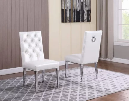 This chic set of 2 side chairs features a sumptuous velvet (Grey, Black colors) or faux leather (White color) with a unique stainless steel frame that combines comfort with beauty, suitable to complement dining sets.