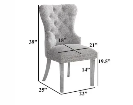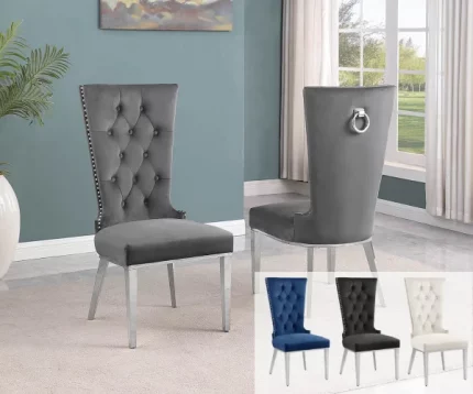 A set of 2 elegant side chairs upholstered with velvet fabric and a silver stainless steel frame. These chairs feature a button-tufted seat back, adjustable feet, ring hardware, and silver nail-head trim. Available in colors Dark Gray, Black, and Cream.