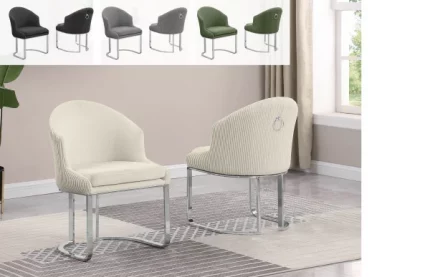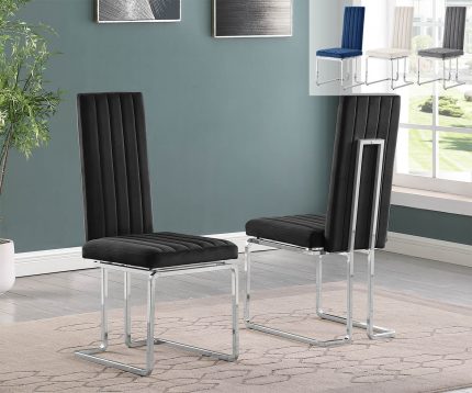 Best Quality Furniture’s unique and modern SC340-3 side chairs with slim chair back with vertical tufts and chrome plated legs. These chairs are upholstered with luxurious velvet fabric and are constructed with durable iron, allowing a weight capacity of 350 lbs. One purchase comes with 2 chairs, and they are available in colors Dark Gray, Black, and Cream.