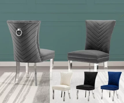 A set of 2 velvet upholstered side chairs with stainless steel legs, available in colors Dark Gray, Black, and Cream. These chairs have angle tufted stitching, adjustable legs, silver nail-head trimming, and ring hardware. One purchase comes with 2 chairs, and minimal assembly is required.