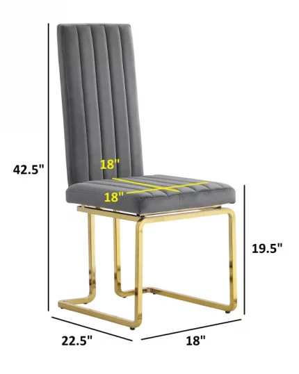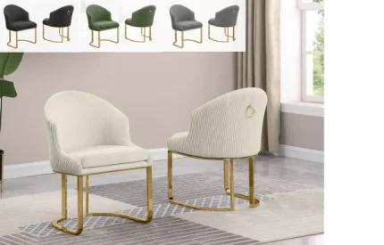 Best Quality Furniture’s unique and modern SC344-7 side chairs with slim chair back with vertical tufts and gold chrome-plated legs. These chairs are upholstered with luxurious velvet fabric and are constructed with durable iron, allowing a weight capacity of 350 lbs. One purchase comes with 2 chairs, and they are available in colors Dark Gray, Black, and Cream.