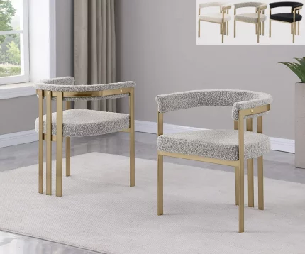 An upscale set of 2 side chairs, upholstered with high-quality Boucle fabric and a gold chrome-plated base with a brushed matte finish. These chairs feature a boucle fabric seat and backrest, and a vertical ladder-back design. Available in colors Rich Gray, Gray, Black, and Cream.