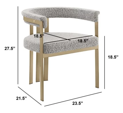 This newest collection of side chairs from Best Quality Furniture offers a sophisticated touch to any contemporary setting. Designed with both style and comfort in mind, each set includes two side chairs, making it a convenient option for updating your dining area, kitchen counter, or home bar. A sturdy iron base boasts a luxurious gold chrome finish, providing durability and a sleek, modern look. For added comfort, each side chair is equipped with a leg rest. The seats are upholstered in plush teddy fabric, known for its textured feel. This fabric not only adds comfort but also contributes to the chairs’ chic appearance. The backrest features a pleated design and features a decorative small back ring to match the base. Light assembly is required; all necessary hardware is included.