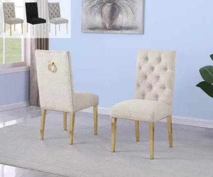 Enhance your dining room with our new boucle fabric side chairs, featuring a button tufted back and chrome ring hardware. The boucle upholstery offers a soft, textured finish, while the sleek chrome legs provide modern style and durability. Available in colors Rich Gray, Gray, Black, and Cream, with finishes in Gold chrome. Perfect for contemporary and glam dining rooms, these chairs are a versatile option that enhances any space.