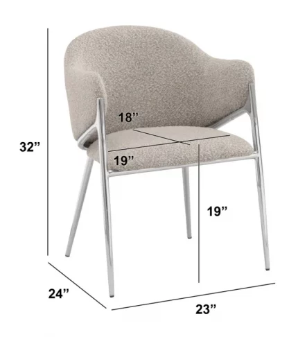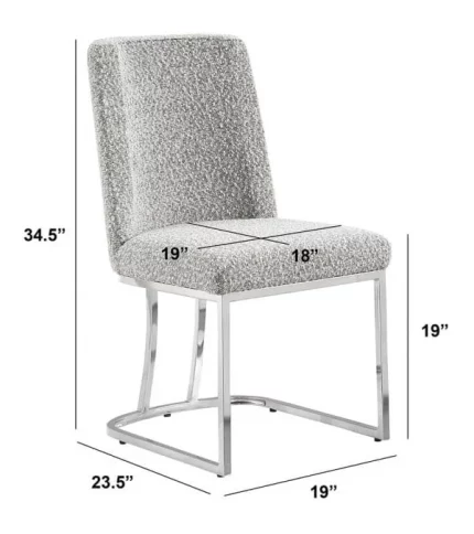 Enhance your dining room with our new boucle fabric side chairs, featuring a minimalistic seat design and sled base. The boucle upholstery offers a soft, textured finish, while the sleek chrome legs provide modern style and durability. Available in colors Rich Gray, Gray, Black, and Cream, with finishes in Silver chrome. Perfect for contemporary and glam spaces, these chairs are a versatile option that enhances any room.