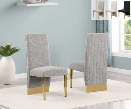 An upscale set of 2 side chairs, upholstered with high-quality Boucle fabric and an iron, gold, chrome-plated base. These chairs feature a gold chrome nailhead trim and floor adjusters and are available in colors Rich Gray, Gray, Black, and Cream.