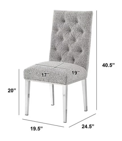 Enhance your dining room with our new boucle fabric side chairs, featuring a button tufted back and chrome ring hardware. The boucle upholstery offers a soft, textured finish, while the sleek chrome legs provide modern style and durability. Available in colors Rich Gray, Gray, Black, and Cream, with finishes in Gold or Silver chrome. Perfect for contemporary and glam dining rooms, these chairs are a versatile option that enhances any space.