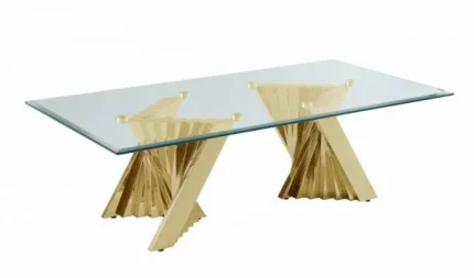 This modern glass coffee table with gold base is surely an unmatched décor. This coffee table piece is crafted of tempered glass 10mm” thick mounted to stainless steel spiral design gold pedestal with foot pads. Available in silver base and gold base.