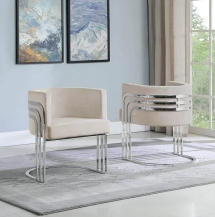 Introducing one of our top sellers—the AC220 to AC227 series. Featuring a luxurious velvet seat with a barrel shape design, it exudes sophistication and comfort. The chair is supported by a striking chrome iron frame that not only provides sturdy support but also adds a touch of glamour with its sleek, art-deco-inspired design. With no assembly required, this chair will perfectly suit a household’s needs.
