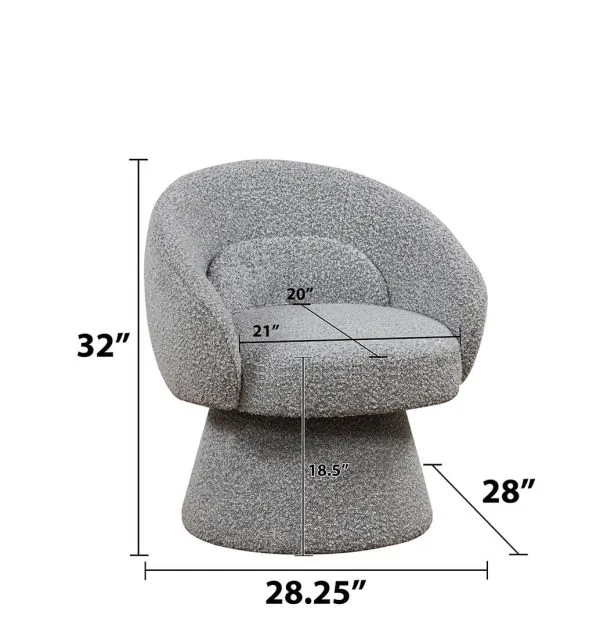 Upgrade your living space with this swivel accent chair upholstered in soft, textured boucle fabric. Designed with a curved backrest and plush cushioning, this modern chair combines style and comfort, making it perfect for a living room, bedroom, or reading nook. The 360-degree swivel base adds functionality, while the sleek silhouette complements both contemporary and minimalist interiors. Available in colors rich gray, black, and cream, you will surely find the right fit for your home.