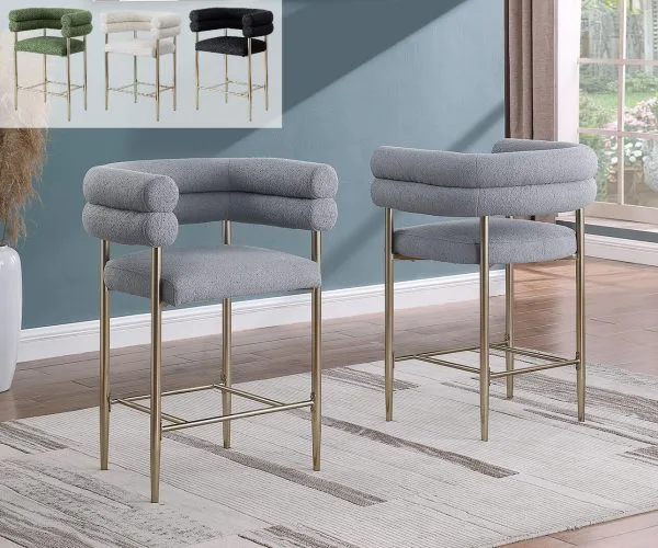 A set of 2 chic counter-height chairs with teddy fur upholstery and gold chrome legs. These stylish chairs feature a low-profile backrest, an iron frame with gold chrome plating, and adjustable levelers to prevent wobble. Available in colors Gray, Black, and Beige, you will surely find the perfect pair for your home.
