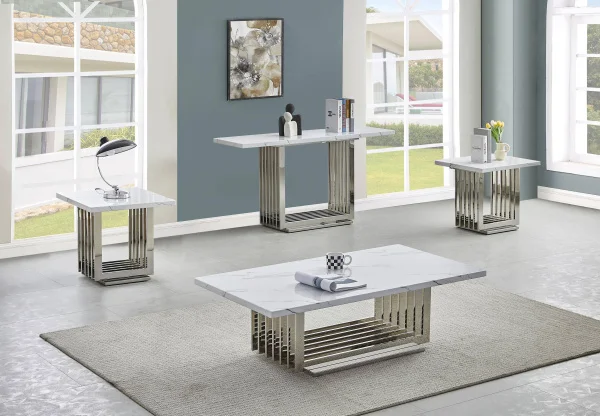 This is a classic 3pc set is perfect for giving your living room a nice classy look with the white marble top and polished stainless steel finish on these sleek coffee, end, and console tables.