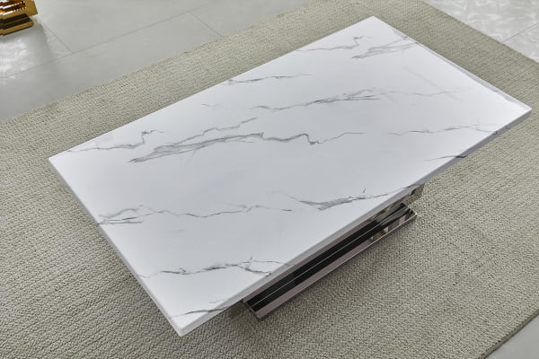 Best Quality Furniture’s unique and modern CT310-312 coffee table collection, featuring a sleek white marble top and durable stainless steel base. The stainless steel has a polished finish, giving it a mirrored look. Available as a 2-4 piece set with a coffee table, end table(s), and/or console table.