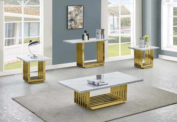 Best Quality Furniture’s unique and modern CT313-315 coffee table collection, featuring a sleek white marble top and durable gold stainless steel base. The stainless steel has a polished finish, giving it a mirrored look. Available as a 2-4 piece set with a coffee table, end table(s), and/or console table.