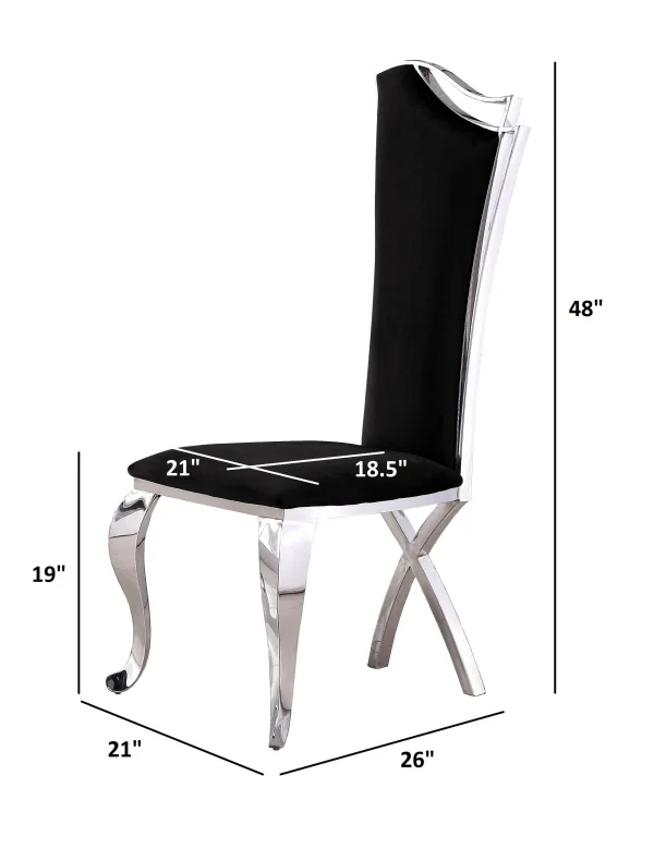 An elegant pair of side chairs with a stainless steel frame and luxurious upholstery, available in colors Black velvet, Navy Blue velvet, Dark Gray velvet, and White faux leather.