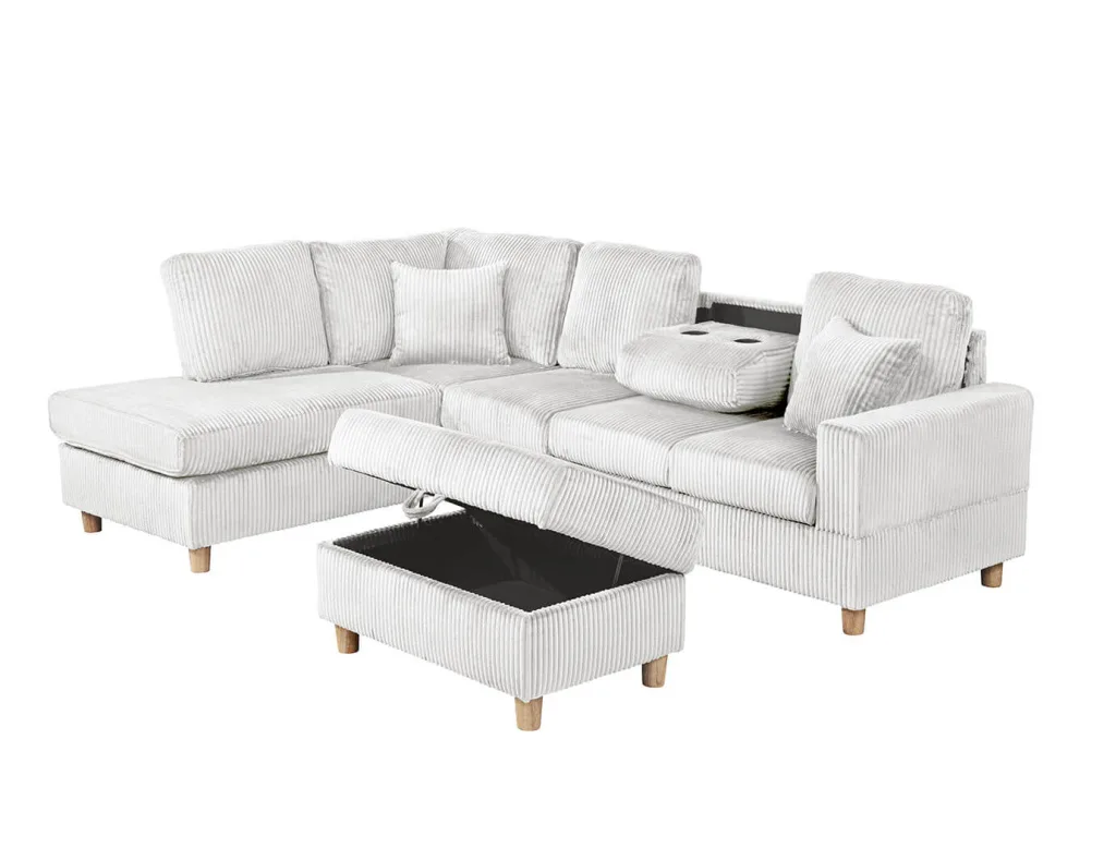 Transform your living room with this modern velvet corduroy sectional and ottoman set. Designed for both comfort and function, this cozy sectional features soft ribbed upholstery, plush cushions, and built-in cup holders, while the matching ottoman offers hidden storage for added convenience. Perfect for lounging, entertaining, or maximizing space with style.