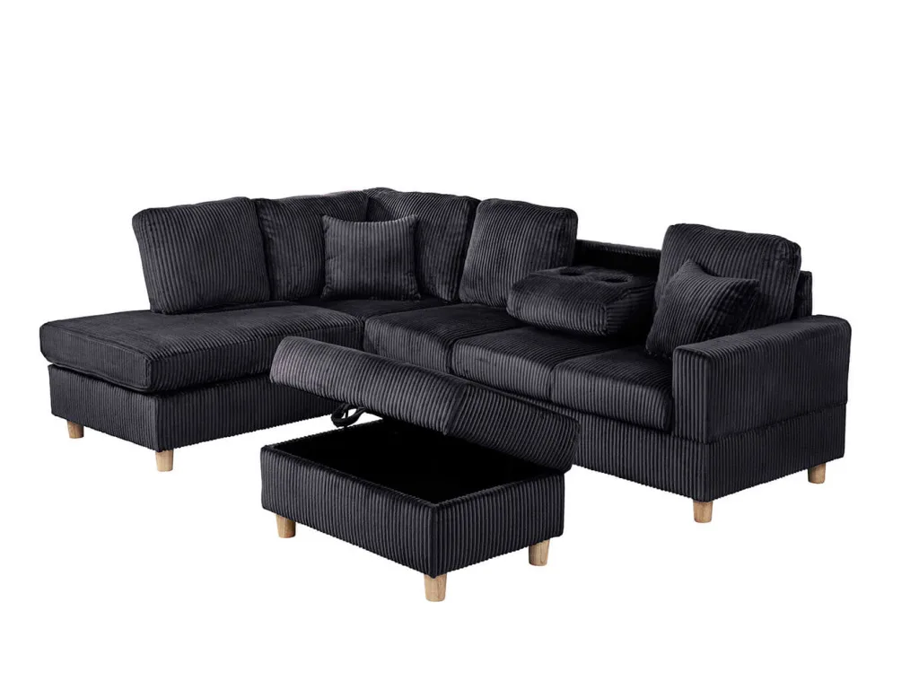 Transform your living room with this modern velvet corduroy sectional and ottoman set. Designed for both comfort and function, this cozy sectional features soft ribbed upholstery, plush cushions, and built-in cup holders, while the matching ottoman offers hidden storage for added convenience. Perfect for lounging, entertaining, or maximizing space with style.
