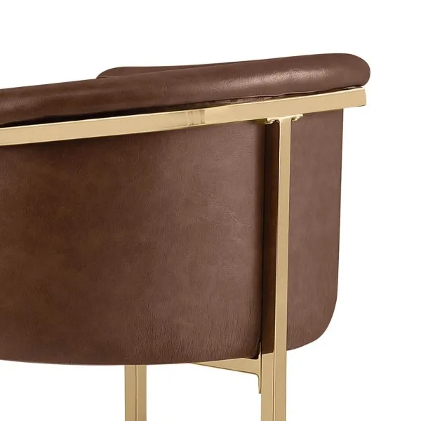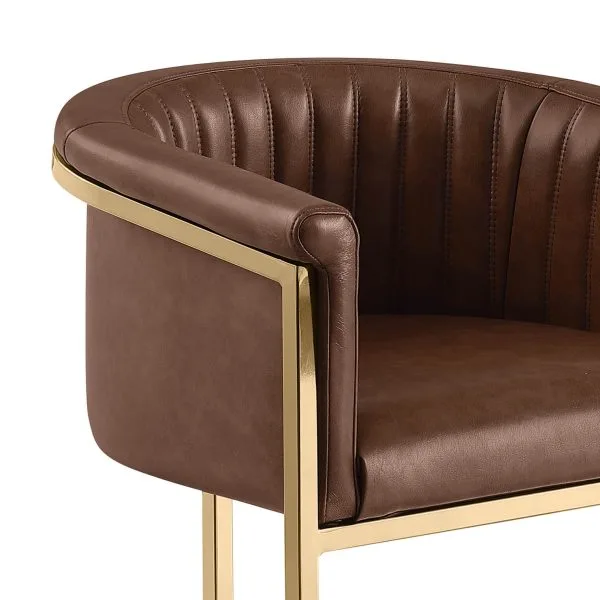 Elevate your space with this modern Leathaire accent chair featuring a sleek gold chrome frame. This chair is a fresh take on our top–selling AC220–3 series, and available in upholstery colors Mocha, Toffee, and Espresso. Designed with a barrel back cushion and striped gold bands, this chair blends luxury and comfort for any dining room, living room, or office.