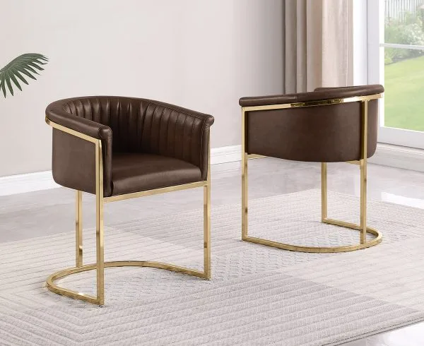 Add a touch of modern luxury to your space with this pair of Leathaire (faux leather) arm chairs, featuring a sleek gold chrome frame and vertical channel stitching. The soft, durable Leathaire upholstery mimics genuine leather while being easy to maintain, and is available in colors Mocha, Toffee, and Espresso. Perfect for dining rooms, offices, or lounge areas, these stylish chairs enhances any modern or glam interior.