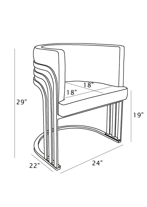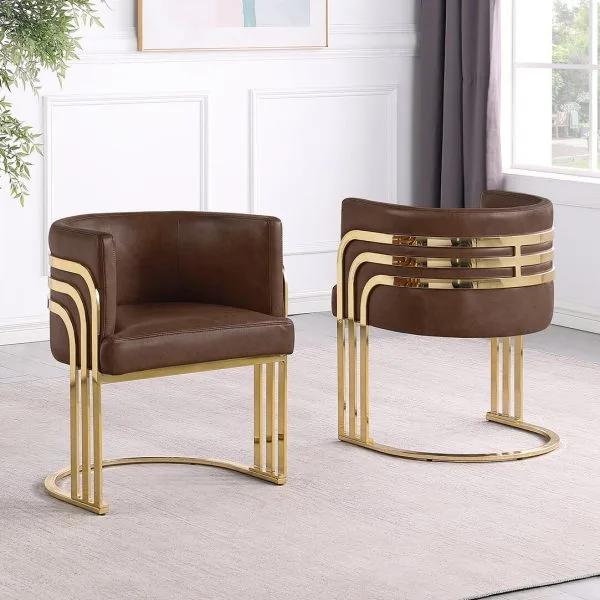 Elevate your space with this modern Leathaire side chair featuring a sleek gold chrome frame. These chairs are a fresh take on one of our top-selling series, SC024 – 7. Designed with a barrel back cushion and striped gold bands, this chair blends luxury and comfort for any dining room, living room, or office. Available in upholstery colors Mocha, Toffee, and Espresso. Assembly required.