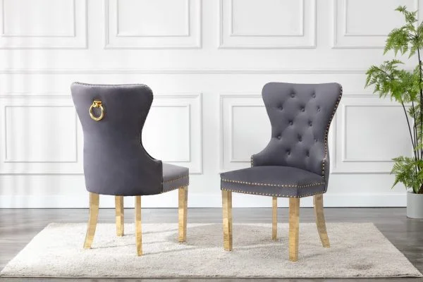 A set of 2 velvet upholstered side chairs with gold stainless steel legs, nail-head trimming, tufted seat backs, and gold ring handles. Available in Dark Grey, Navy Blue, Black, and Cream.