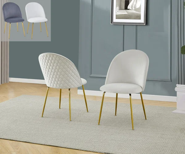 Best Quality Furniture’s stylish and unique side chairs with a quilted back design, available in colors Dark Gray velvet, Cream velvet, and White faux leather. The legs are constructed with durable iron and have a gold chrome finish for an elegant look.