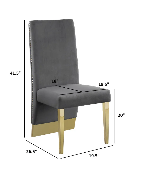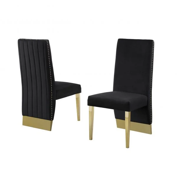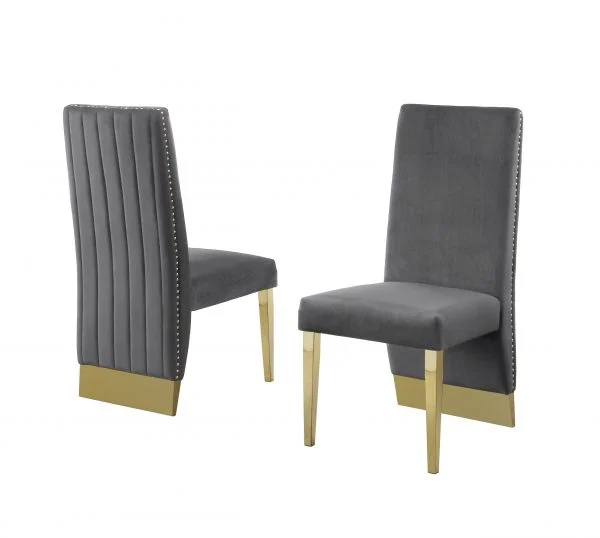 This set of two (2) velvet chairs features two gold-chrome front legs with a gold-chrome support. Available in grey, black, or cream, featuring nail-head trim and vertical tufted design.