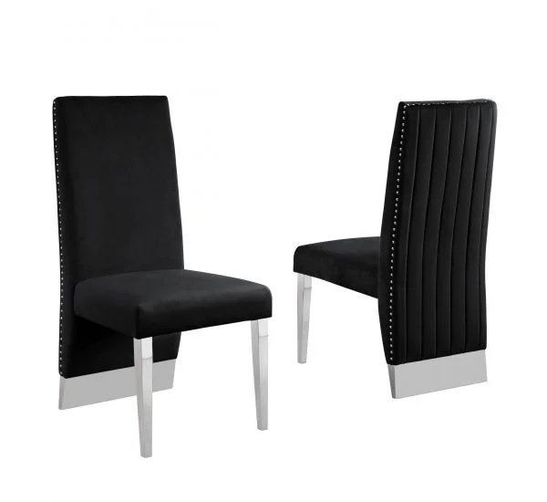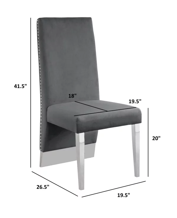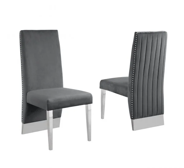 This set of two (2chairs per box) velvet chairs features two chrome front legs with a chrome support. Available in grey, black, or cream, featuring nail-head trim and vertical tufted design.