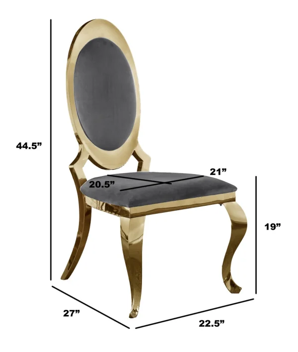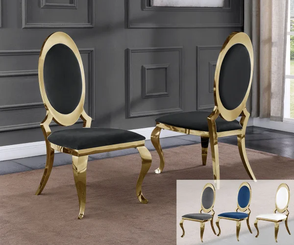 This classic set of 2 side chairs features a sumptuous velvet (Grey, Black colors) or faux leather (White color) with a unique gold stainless steel frame that combines comfort with beauty, suitable to complement dining sets.