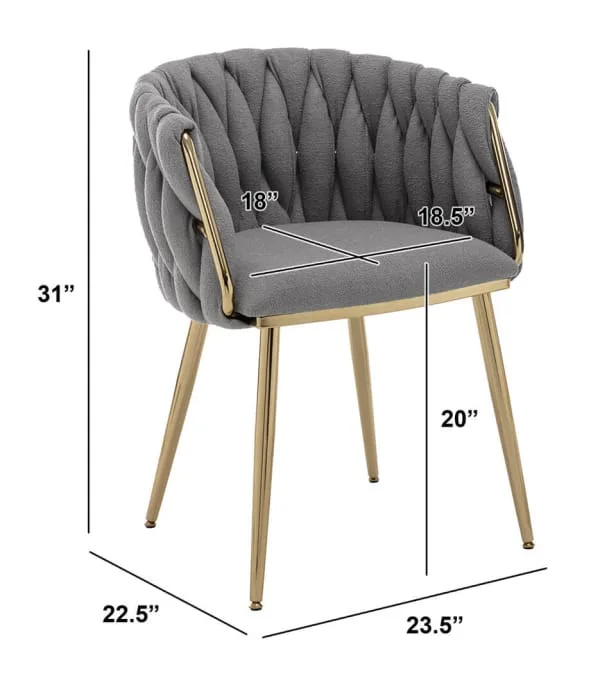 Upgrade your dining or living space with these luxurious boucle fabric side chairs. Featuring a unique braided backrest design and soft boucle upholstery, these chairs combine elegance with comfort. The sleek gold chrome frame and legs provide a sturdy foundation and a glamorous touch, perfect for contemporary or chic interiors. With their stylish barrel-style silhouette, these chairs are ideal as dining chairs, vanity seating, or accent pieces, enhancing any room with sophistication and versatility.