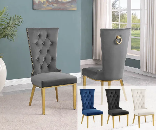 A set of 2 elegant side chairs upholstered with velvet fabric and a gold stainless steel frame. These chairs feature a button tufted seat back, adjustable feet, ring hardware, and gold nail-head trim. Available in colors Dark Gray, Black, and Cream.