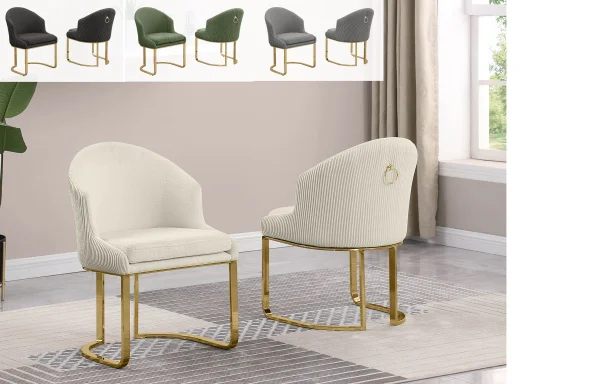 This newest collection of side chairs from Best Quality Furniture offers a sophisticated touch to any contemporary setting. Designed with both style and comfort in mind, each set includes two side chairs, making it a convenient option for updating your dining area, kitchen counter, or home bar. A sturdy iron base boasts a luxurious gold chrome finish, providing durability and a sleek, modern look. For added comfort, each side chair is equipped with a leg rest. The seats are upholstered in plush teddy fabric, known for its textured feel. This fabric not only adds comfort but also contributes to the chairs’ chic appearance. The backrest features a pleated design and features a decorative small back ring to match the base. Light assembly is required; all necessary hardware is included.