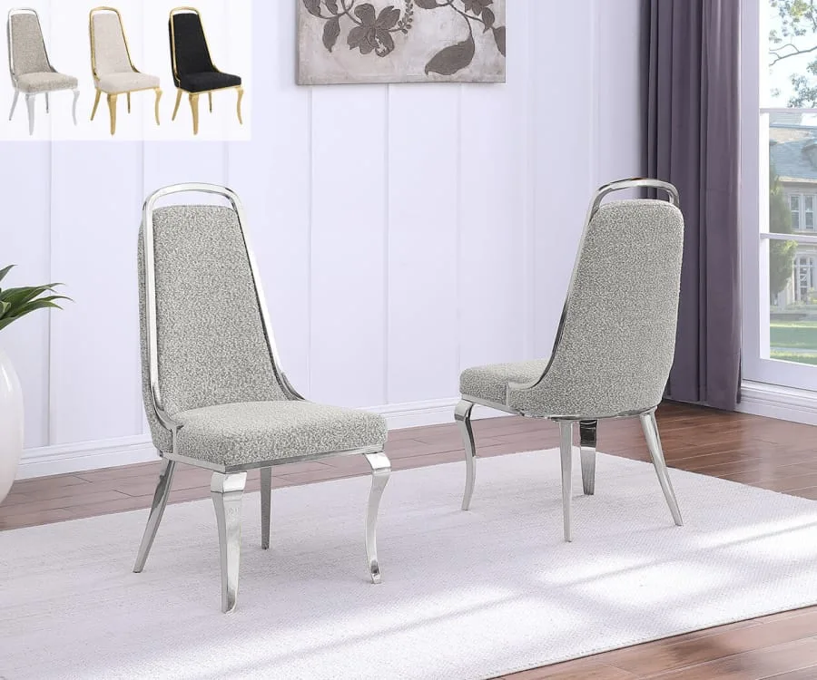 An upscale set of 2 side chairs, upholstered with high-quality Boucle fabric and a gold chrome-plated base. These chairs feature a sled leg design and floor adjusters, and are available in colors Rich Gray, Gray, Black, and Cream.