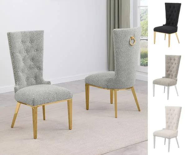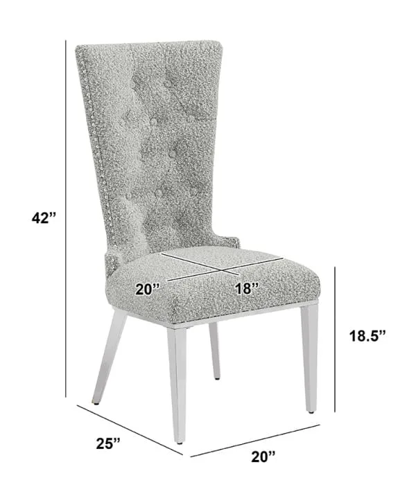 Enhance your dining room with our new boucle fabric side chairs, featuring a high-back design with tufted button detailing and nailhead trim. The boucle upholstery offers a soft, textured finish, while the sleek chrome legs provide modern style and durability. Available in colors Rich Gray, Gray, Black, and Cream, with finishes in Silver chrome. Perfect for contemporary and glam dining rooms, these chairs are a versatile option that enhances any space.