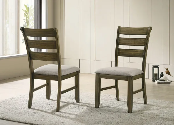 Upgrade your dining space with these classic ladder back side chairs with beige fabric seats and antique brown wood frames. One purchase includes 2 chairs.