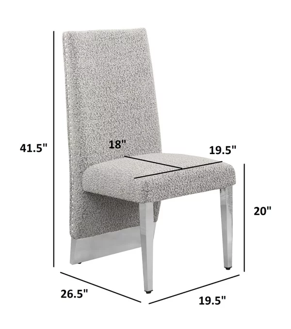 An upscale set of 2 side chairs, upholstered with high-quality Boucle fabric and an iron chrome-plated base. These chairs feature a chrome nailhead trim and floor adjusters and are available in colors Rich Gray, Gray, Black, and Cream.