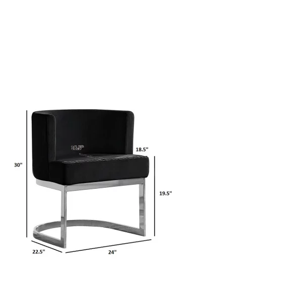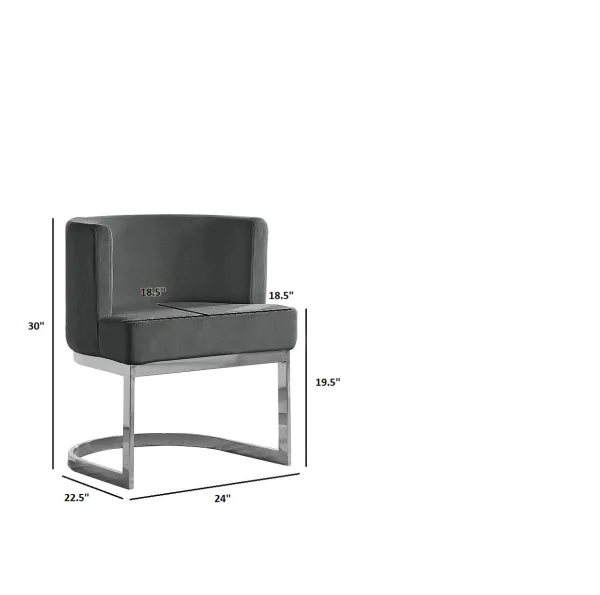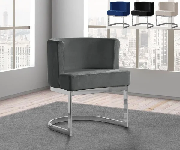 This side chair displays a classic barrel and round backrest in silky smooth velvet, accented with a sled-style base for stability, and a durable iron frame with chrome plating. Customers can choose 4 colors for the fabric: dark grey, navy blue, black, or cream.