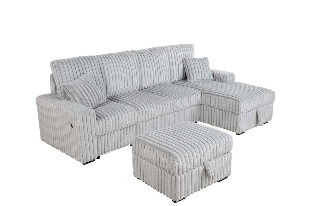 Transform your living room into the ultimate relaxation hub with this versatile 3 or 4-piece sectional and matching ottoman. Designed for comfort and convenience, the loveseat easily converts into a pullout bed for overnight guests, while the chaise and ottoman open to reveal generous hidden storage. A clever drop-down back cushion doubles as a table with two sleek stainless steel cupholders—perfect for movie nights or casual entertaining. Plus, a built-in USB charging port on the left arm keeps devices powered without clutter. Wrapped in luxuriously soft, 50mm wide corduroy, this sectional combines modern style, functionality, and cozy appeal in one show-stopping centerpiece.