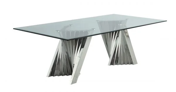 Give your dining room an unforgettable, luxurious look with this beautiful modern glass dining table. The thick clear tempered glass top is supported by a double pedestal base made of stainless steel, and attaches to the table top to provide stability. The unique, artistic design brings a distinctly glamorous, upscale look to any dining space.