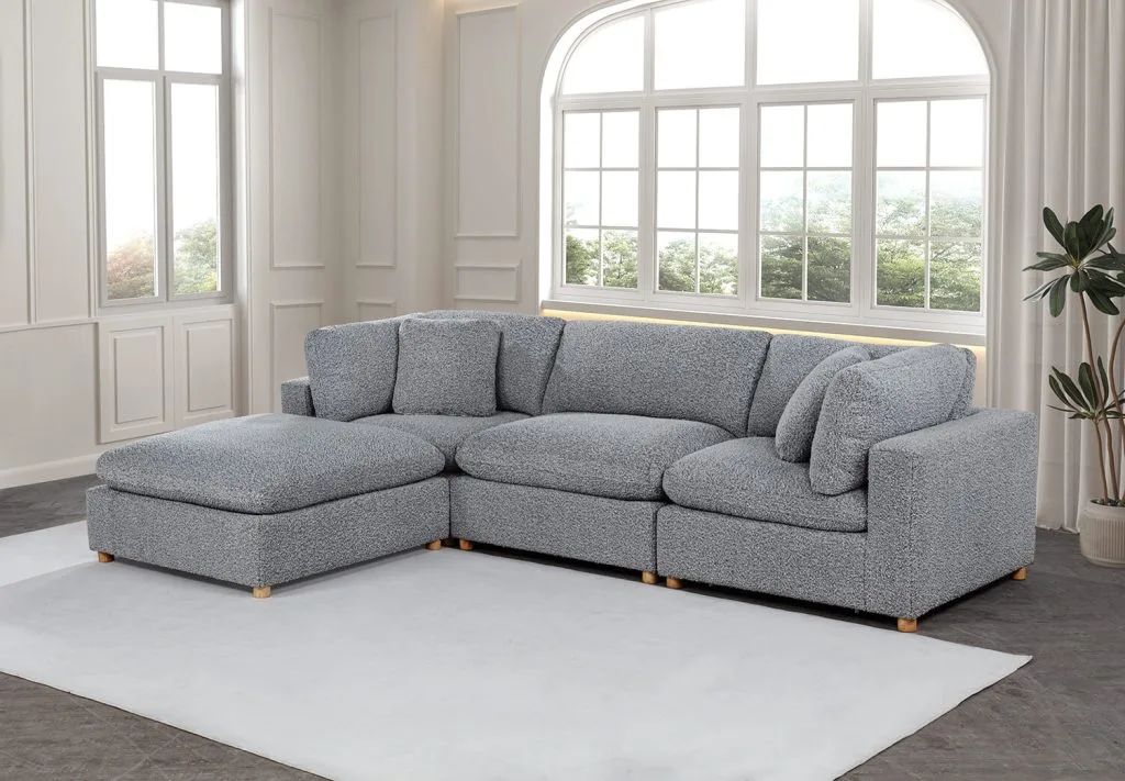 Add elevated comfort and timeless style to your living room with this modular sectional sofa, upholstered in soft and durable boucle fabric in your choice of 3 versatile colors: rich gray, black, & cream. Designed with plush, down-filled, & reversible cushions, this sectional is perfect for lounging, hosting, or relaxing with family & friends. Its modular design offers flexible seating configurations to fit any space, while the solid wood legs add a touch of natural warmth.
