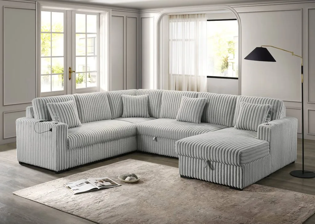 Maximize your comfort and space with this contemporary U-shaped sectional sofa, upholstered in ultra-soft 1.5″ corduroy fabric. Designed for versatility, it features a convenient pull-out bed and hidden storage chaise—perfect for small apartments, guest stays, or movie nights. Plush accent pillows are provided, as well as built-in USB charging ports and stainless-steel cup holders for added convenience. This sectional effortlessly blends function, style, and comfort to elevate any living room.